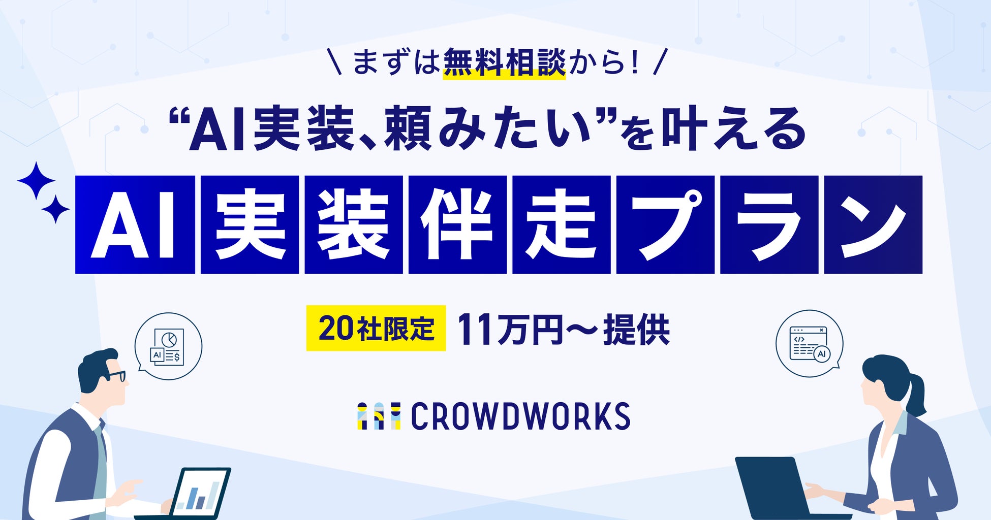 フリーランス業界最大級プラットフォーム(登録ワーカー含む登録ユーザー数700万人・登録企業100万社(*1))を基盤に、IT人材&DXコンサルティングサービスを提供する株式会社クラウドワークス(本社:東京都港区 代表取締役社長 兼 CEO:吉田 浩一郎 以下「当社」)は、2026年3月18日(水)より、各企業の実態に合わせたAI開発を一気通貫で完結させる「AI実装伴走プラン」を20社限定・税込11万円(*2)から提供を開始します。