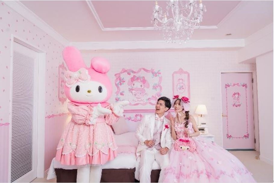 結婚式の幸せな思い出を胸に、パステルピンクのリボンやイチゴ、パールの可愛い小物がちりばめられたお部屋で、マイメロディの世界観をそのままお楽しみください。