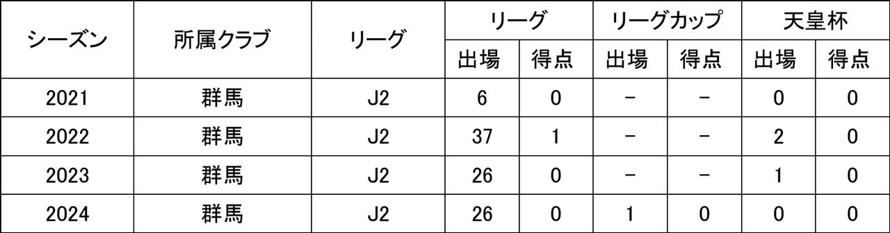 所属歴/ FC八幡ビーバーズ – 柏レイソルU-15 – 柏レイソルU-18 – 法政大 – ザスパ群馬