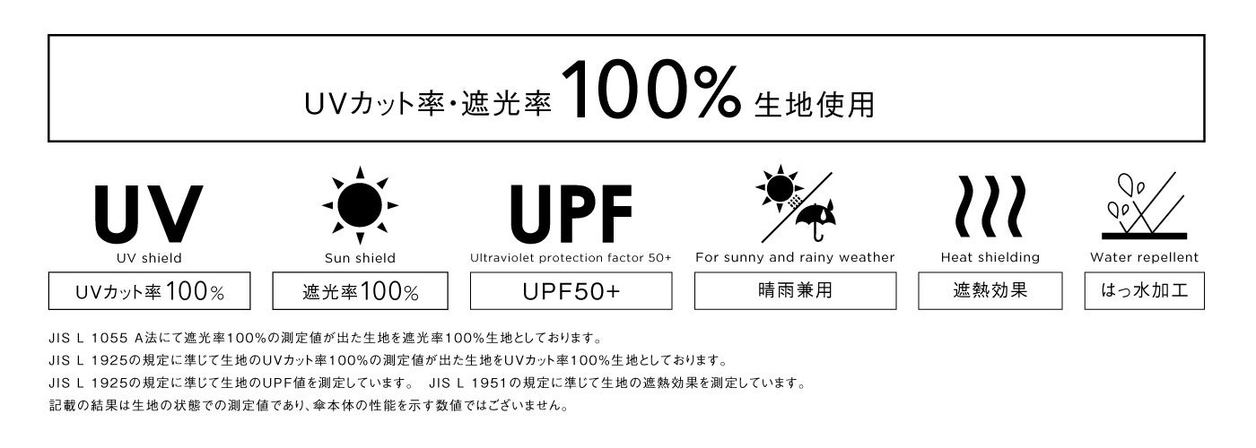 *1 JIS L 1925の規定に準じて生地のUVカット率100%の測定値が出た生地をUVカット率100%生地としております。JIS L 1055 A法にて遮光率100%の測定値が出た生地を遮光率100%生地としております。JIS L 1925の規定に準じて生地のUPF値を測定しています。