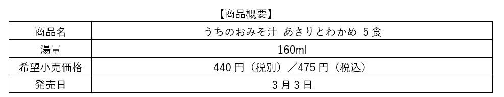 ・ラインアップは、今回発売する「あさりとわかめ」に加えて「なすとお揚げ 5食」「なめことわかめ(赤だし) 5食」「4種の野菜 5食」「減塩 なすとお揚げ 5食」「減塩 4種の野菜 5食」です