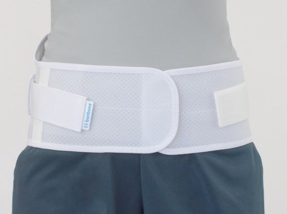 左右の補助ベルトを重ねて留められるようになりました。本体の幅に補助ベルトが収まるので、面ファスナーが服に付くことを気にする必要もありません。