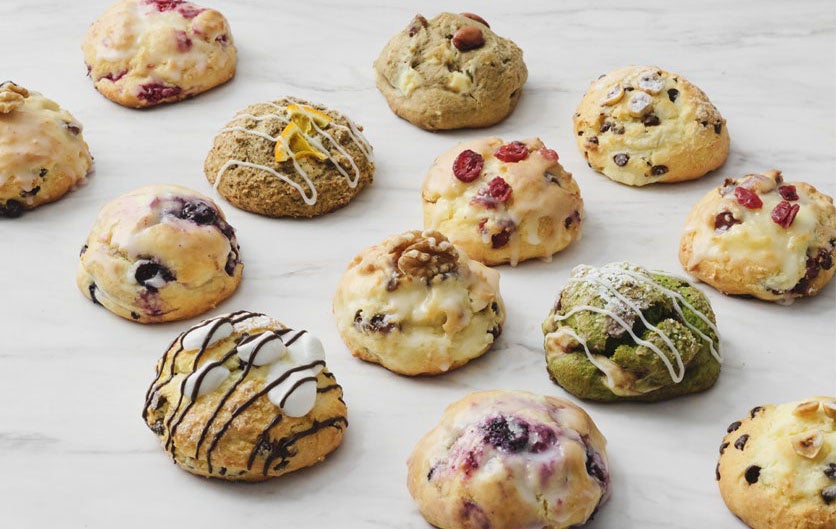 一般的に知られている筒型の「イングリッシュスコーン」とは違って、クリームチーズをたっぷり入れた生地にフルーツなどの具材を混ぜ込んだ、ハワイで人気のスコーンです。