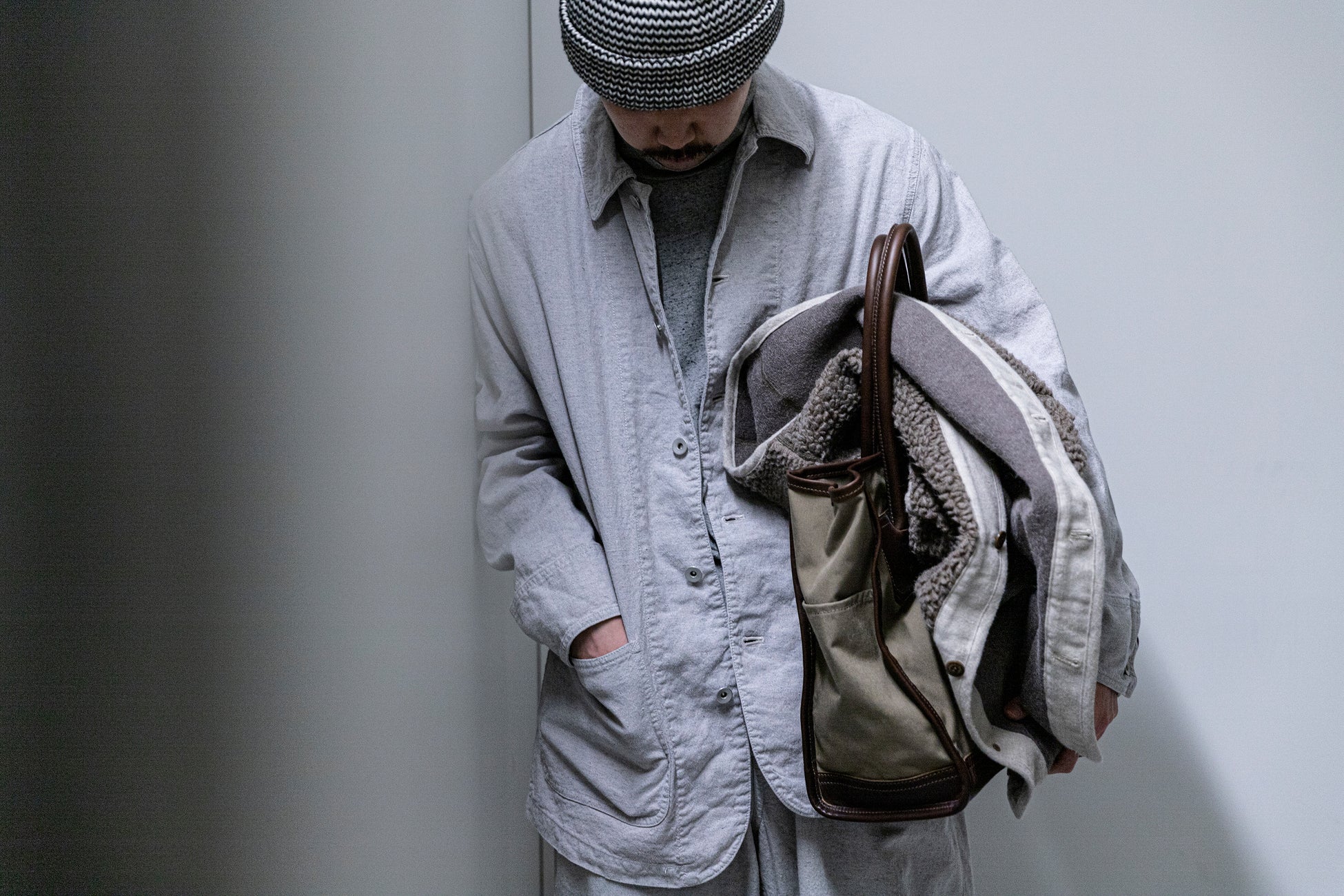 経糸に、リネン100%糸を。緯糸に、デニムから生まれたリサイクル糸を打ち込んだキャンバス生地、「UpcycleLinoデニム混キャンバス」と命名。中肉厚のキャンバス生地は、デニムよりも薄手で軽やかな着心地となります。複雑に混じり合った青味やグレー味を持つ繊維により、言葉での表現が難しい、特色あるファブリックです。