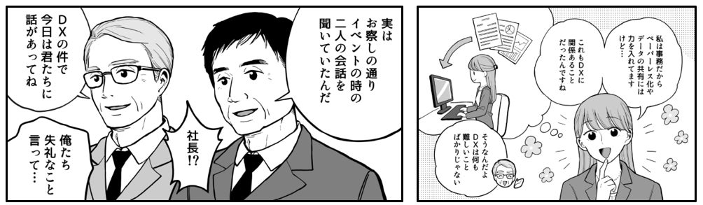 コミックには、社内の実際の役員を登場させるなど、できるだけDX化を自分事として捉えてもらえるよう工夫