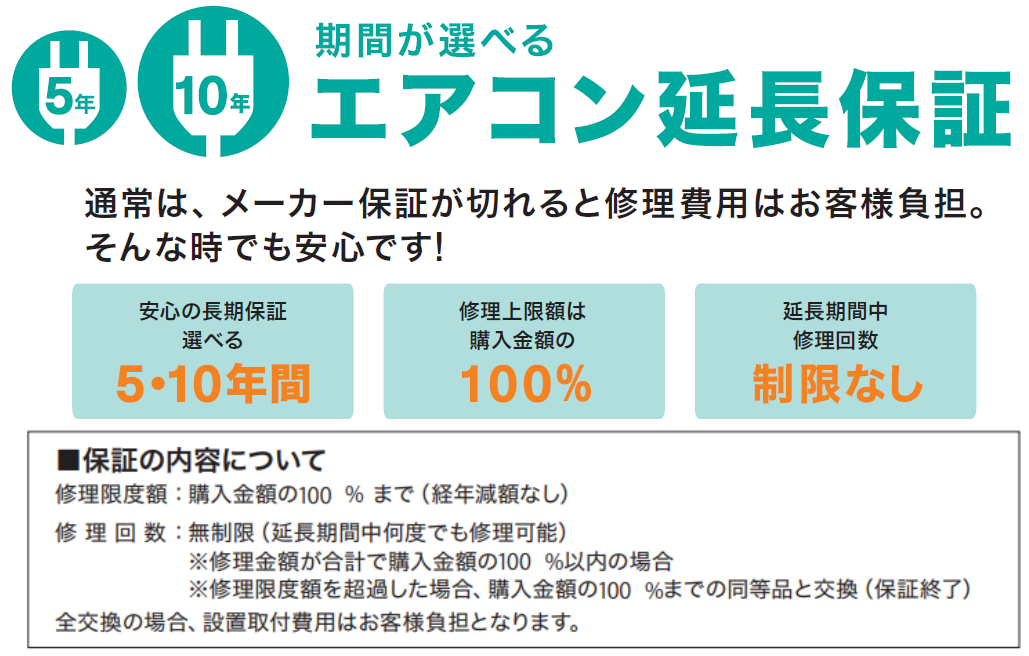 (例)エアコン本体価格99,900円(税込)ご購入の場合:10年延長保証15,000円(税込)を、本体価格のみでご提供!