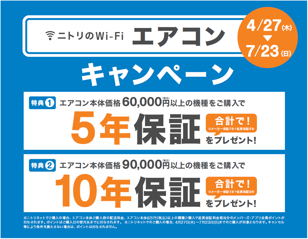 【ニトリ】エアコンキャンペーン、4/27(木)~7/23(日)開催!より長く安心して使える、長期延長保証プレゼント!配送料金無料サービスもスタート