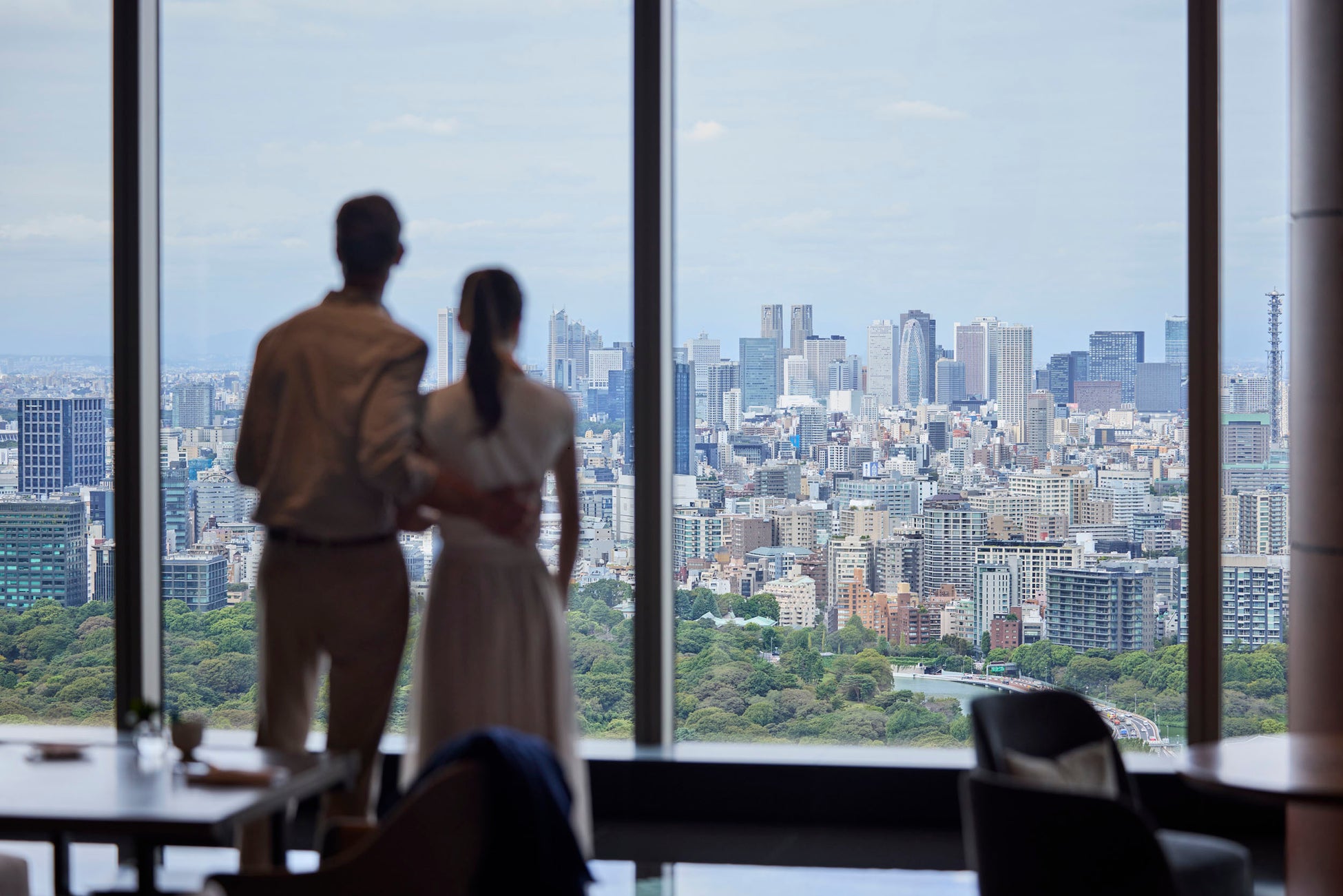 ホテル最上階の39階でエレベーターを降りると、東京のスカイラインや皇居の庭園、空気が澄む日には遠くに富士山も望めます。壁一面の大きな窓から差し込む自然光とともに、この壮大な景色は額縁に収められた美しい絵画のようです。