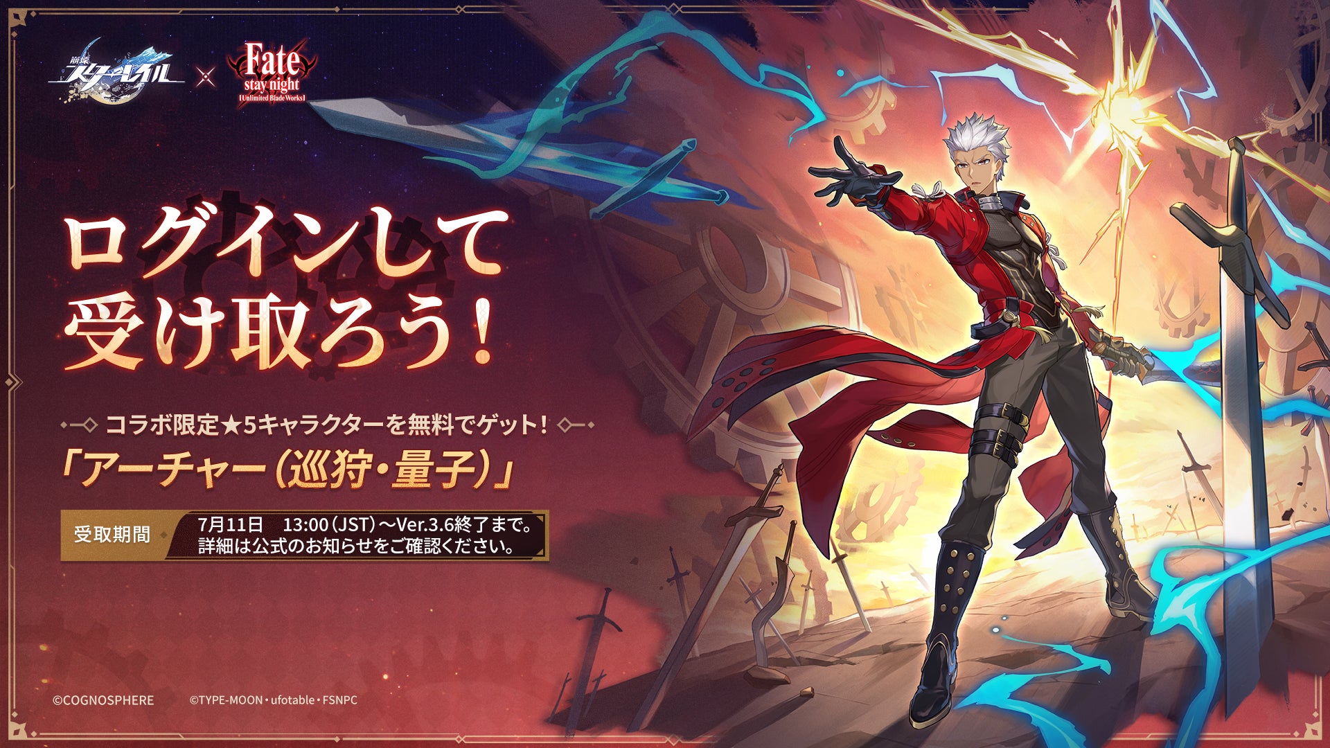昨年のVer.2.4予告番組およびGamescom Opening Night Live 2024にて発表された、『Fate/stay night [Unlimited Blade Works]』とのコラボの詳細がついに公開となります。7月11日(金)より、コラボイベント「美しき夢と聖杯」が開催されます。「セイバー」と「アーチャー」がプレイアブルキャラクターとして登場し、夢の共演を実現するとともに、これからの開拓の旅における頼れる仲間となってくれます。また、イベント開始後にゲームにログインするとすると、限定★5キャラクター「アーチャー(巡狩・量子)」を獲得可能!世間の偽善と相容れない戦士・アーチャー。正義の味方である彼は今回も再び燃え上がり、最後まで戦い続けることでしょう。