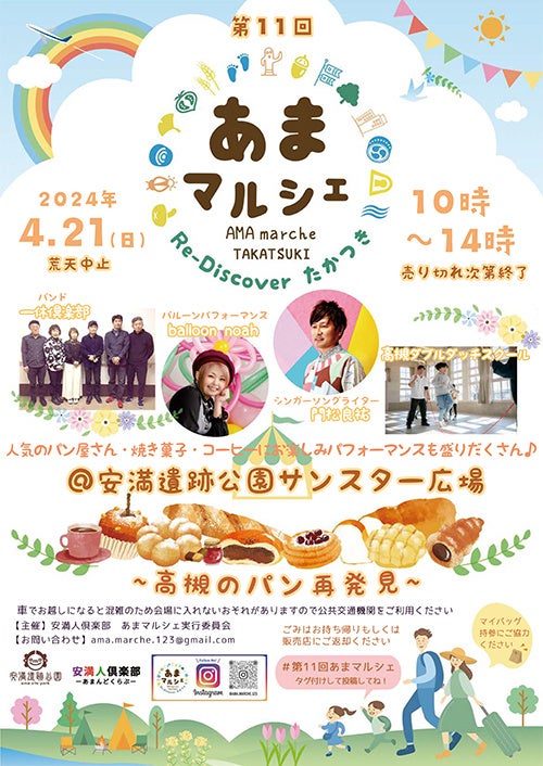 4月21日(日曜日)、安満遺跡公園でパンや焼き菓子、コーヒーを販売する高槻ゆかりの店舗や高槻で営業している店舗が、一日限定で大集合する地域密着型マルシェ「あまマルシェ」を開催します。
