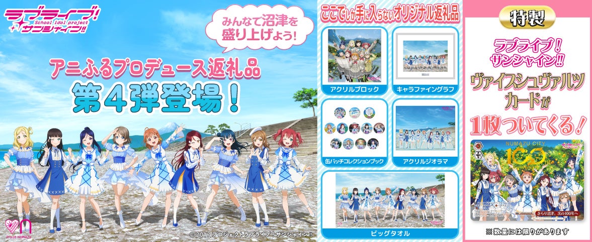 株式会社BS日本(通称「BS日テレ」本社:東京都港区、代表取締役社長:粕谷賢之、以下「BS日テレ」)が運営する、アニメ・マンガ関連の品に特化したふるさと納税サイト「アニふる」で、静岡県沼津市と、同市を舞台にした人気TVアニメ「ラブライブ!サンシャイン!!」がコラボした新作返礼品の予約がスタートします。