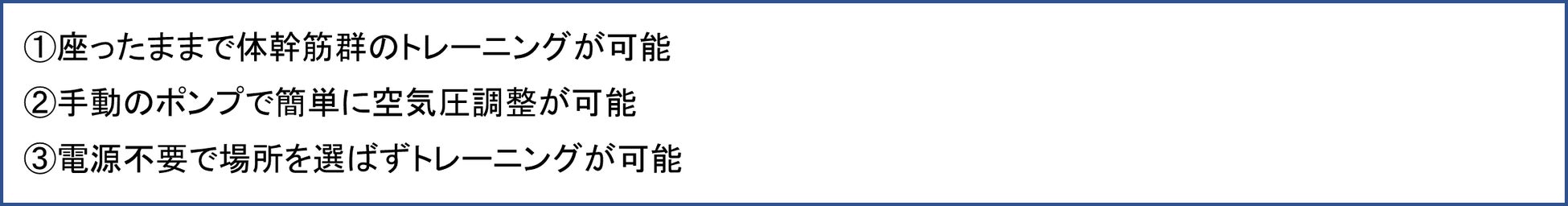 本製品は金沢大学附属病院 整形外科 加藤仁志医師との共同開発製品で、「体幹に巻いたカフからの空気圧に対して押し返す力を発揮」することで、体幹筋群(腹直筋・腹斜筋・腹横筋・横隔膜)のトレーニングを可能にします(特許取得済)。(第45回発明大賞において 「考案功労賞」を受賞)