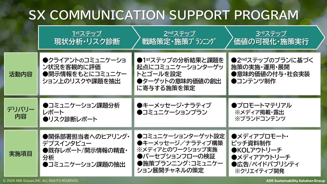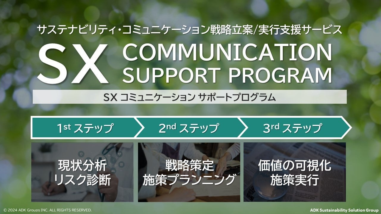 株式会社ADKマーケティング・ソリューションズ(本社:東京都港区、代表取締役社長:大山 俊哉、以下「ADK MS」)は、PR戦略コンサルティング会社の合同会社Takto(本社:東京都中央区、代表:下徹太郎、以下「Takto」)と協業し、サステナビリティコミュニケーションの戦略立案から実行までをワンストップで支援する「SX(サステナビリティ・トランスフォーメーション) コミュニケーション サポートプログラム」を開始しました。