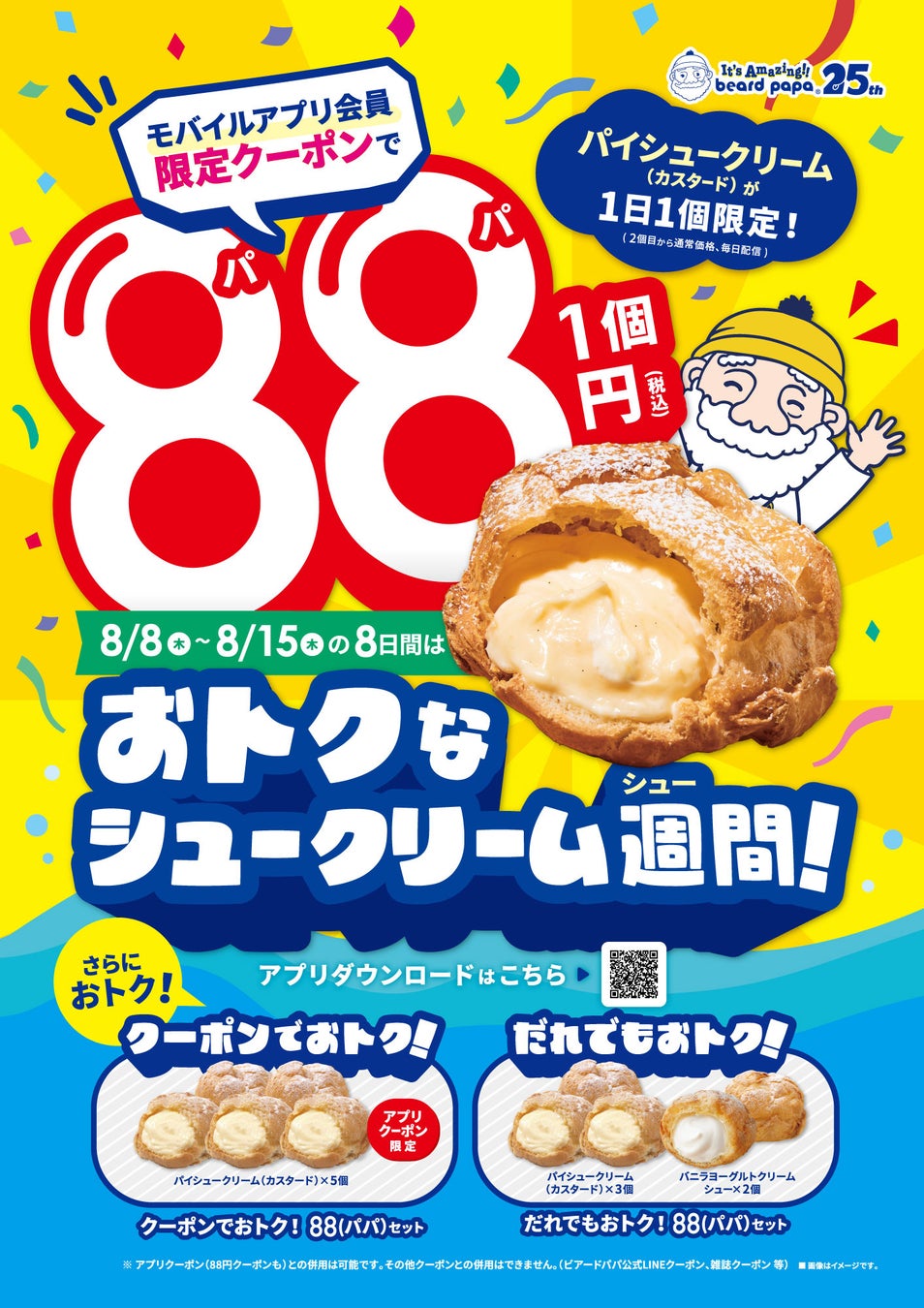 株式会社DAY TO LIFE(本社:大阪府大阪市北区、代表取締役:杉内健吉)は、今年で25周年を迎えたシュークリーム専門店ビアードパパにて2024年8月8日(木)~8月15日(木)の8日間、ビアードパパ25周年のテーマである「It‘s Amazing!!」“驚きの体験”として、ビアードパパが誇る、あっ!と驚く圧倒的なおいしさのシュークリームを特別価格で提供する「おトクなシュークリーム週間!」をほぼ1週間(8日間)開催いたします。この「シュークリーム週間」では、ビアードパパモバイルアプリ会員さま限定で期間中1日1個まで「パイシュークリーム(カスタード)が88円(税込)」で購入できるおトクなクーポン券を8日間連続でお届けするほか、アプリ会員さま限定特別セットの販売(クーポン配信)、アプリ会員さま以外でも直接店舗でご購入可能な特別セットの販売をいたします。ぜひこの機会に、創業当時から変わらず、ご注文を受けてからクリームを詰める“いつも できたて 作りたて”のビアードパパのシュークリームをお楽しみください。