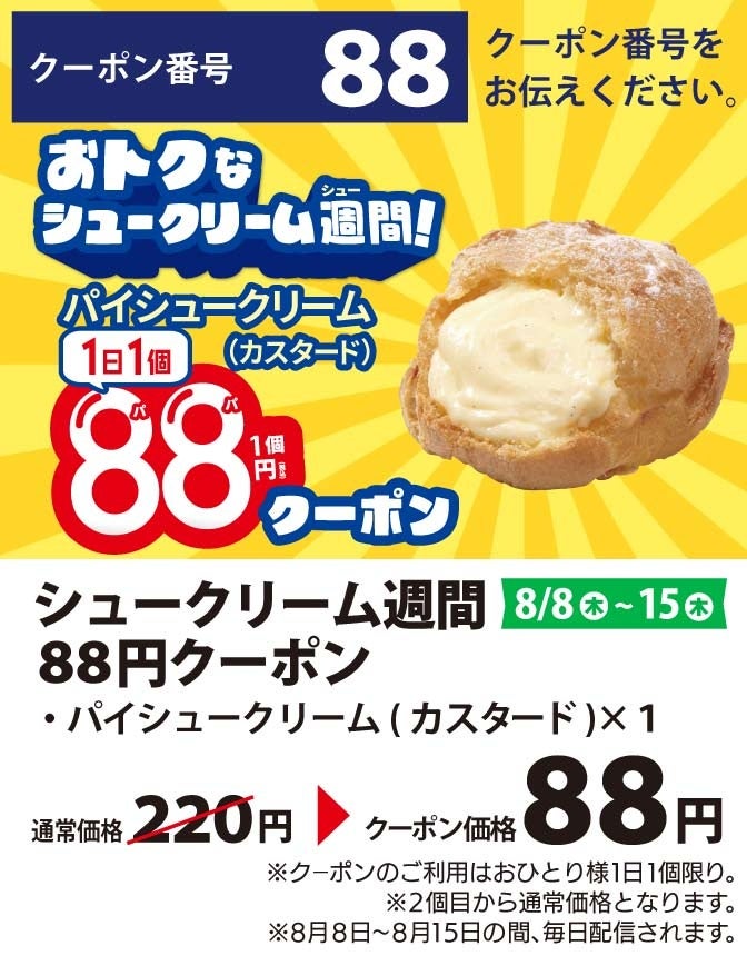 ※アプリ内にて配布されるクーポン(パイシュークリーム88円クーポン)は翌日以降に持ち越すことは出来ません。