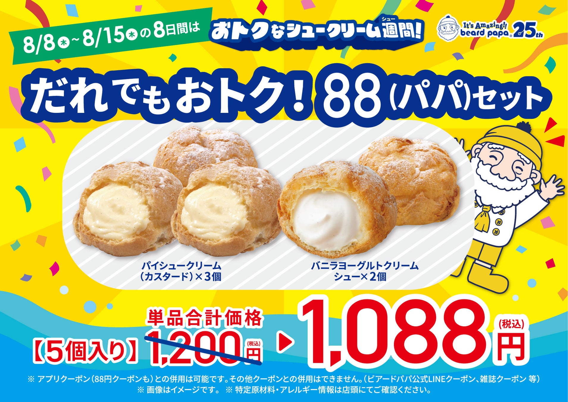 ≪お客さまに25年間愛されてきたおいしさという“驚き”を‼≫25周年を迎えたシュークリーム専門店ビアードパパ今年のパパの日(8月8日)は、「おトクなシュークリーム週間を“ほぼ1週間(8日間)”」開催
