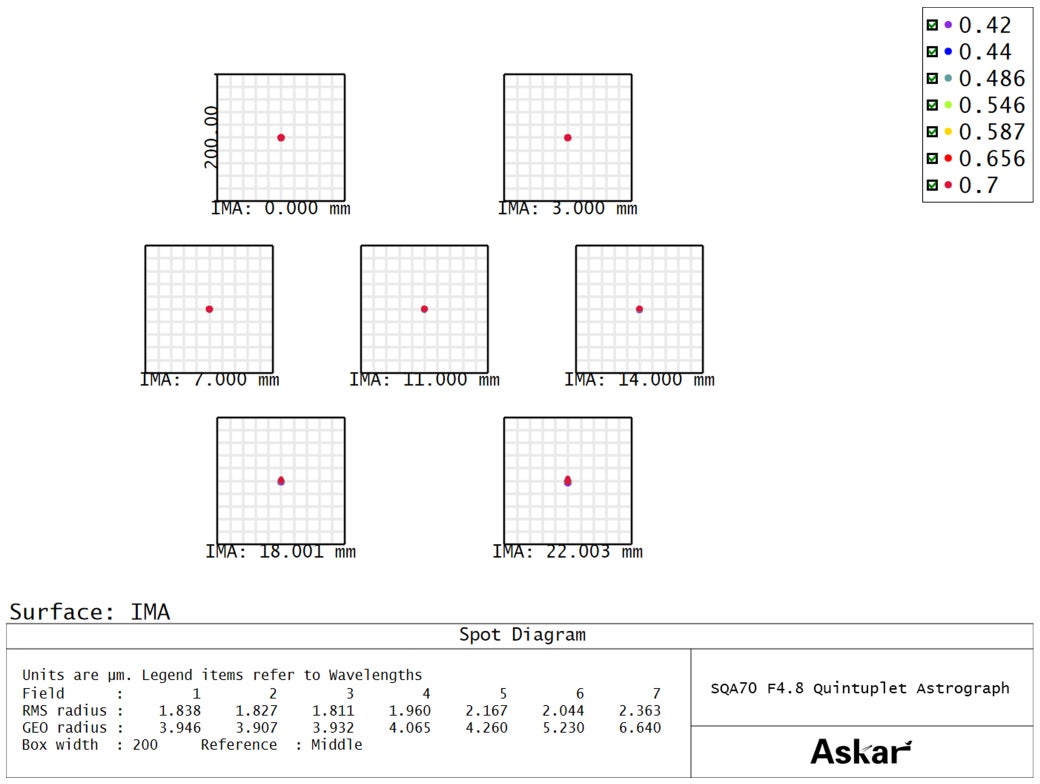 ・中心スポット半径は設計値で1.8μm、イメージサークル44mmの最周辺でも2.3μmと、これまでの天体望遠鏡とは一線を画す驚異的な結像性能を誇ります。