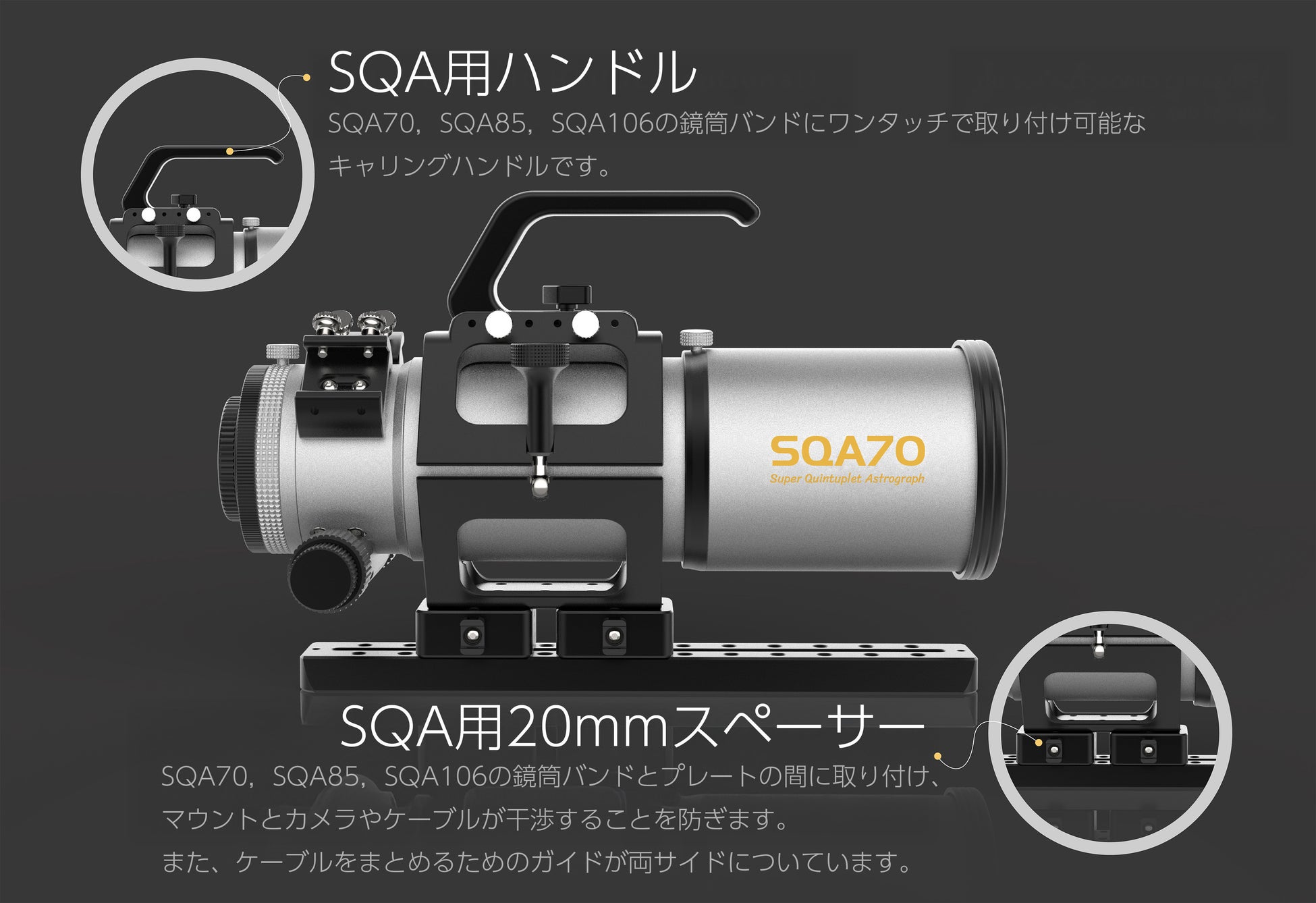 SQA70,SQA85,SQA106の鏡筒バンドにワンタッチで取り付け可能なキャリングハンドルです。工具を使わずにしっかりと固定することができます。