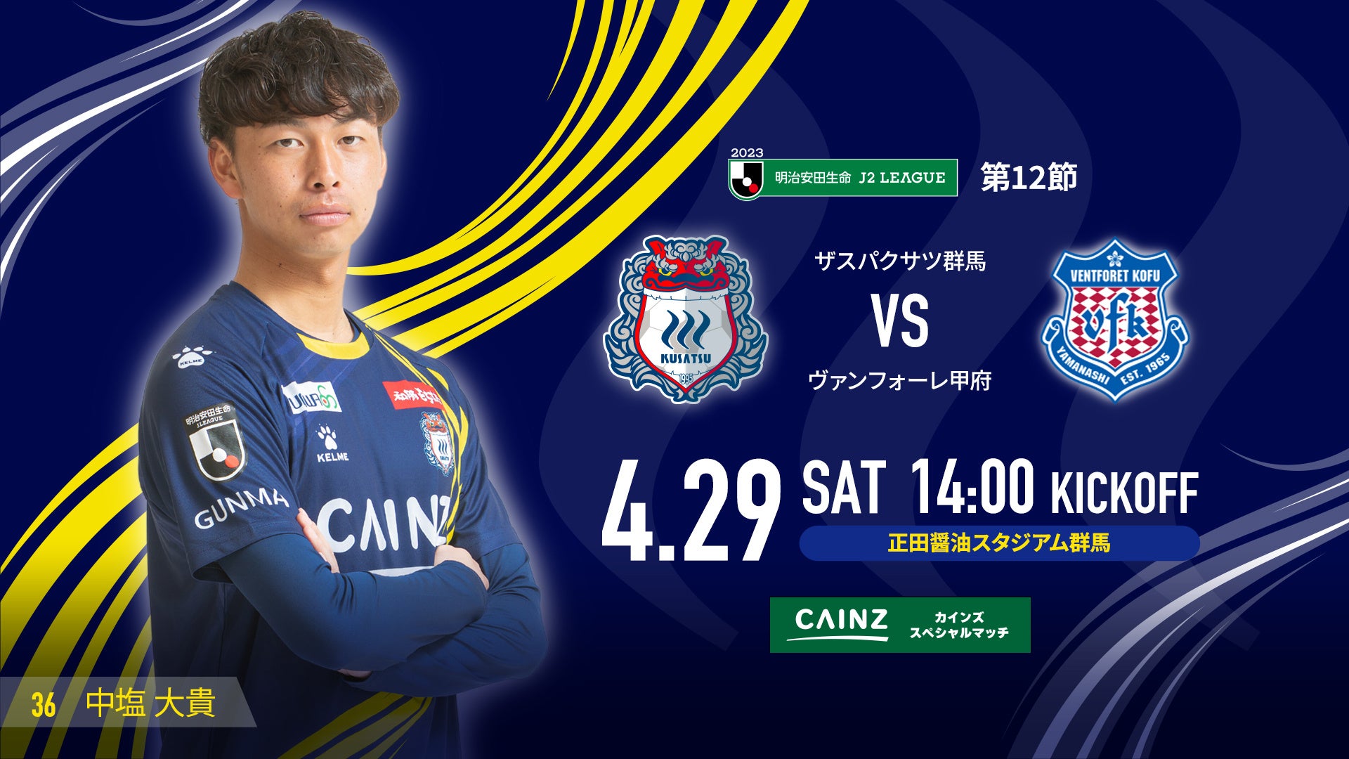 今シーズンのザスパは大槻毅監督のもと、明治安田生命J2リーグ第11節を終えて5勝3敗3分け(4/24現在)と上位争いを繰り広げています。今年の「カインズスペシャルマッチ」は第12節にあたり、ゴールデンウイーク初日の4月29日(土)14時、ホームの正田醤油スタジアム群馬でキックオフ。対戦相手はヴァンフォーレ甲府です。