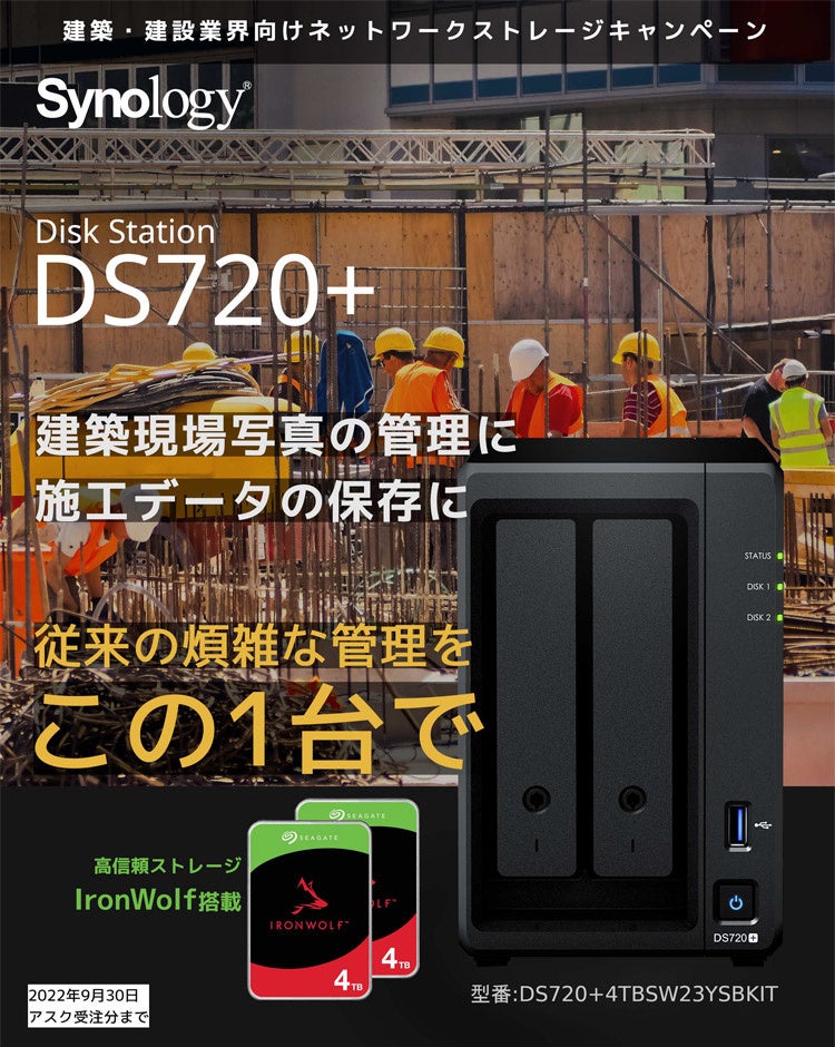 本キャンペーンは、ビジネス向けのファイル管理用途に最適なNAS「DiskStation DS720+」に、Seagate IronWolf 4TB HDDを2台標準搭載したモデルが対象となり、建築・建設業界のお客様向けに、通常販売価格より18,200円お値引きした特別価格にてご提供いたします。