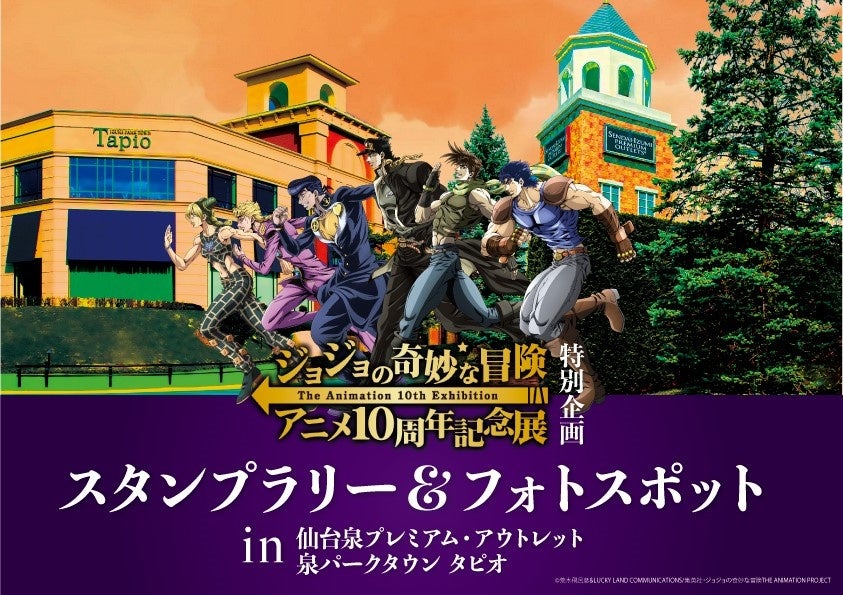 人気アニメ『ジョジョの奇妙な冒険』シリーズの10年間の軌跡が詰まった初の展示会「『ジョジョの奇妙な冒険』アニメ10周年記念展」(以下「記念展」)が仙台会場で開催されることに併せ、スタンプラリーや記念撮影が楽しめるイベント「『ジョジョの奇妙な冒険』アニメ10周年記念展 特別企画 スタンプラリー&フォトスポット in 仙台泉プレミアム・アウトレット/泉パークタウン タピオ」を開催します。