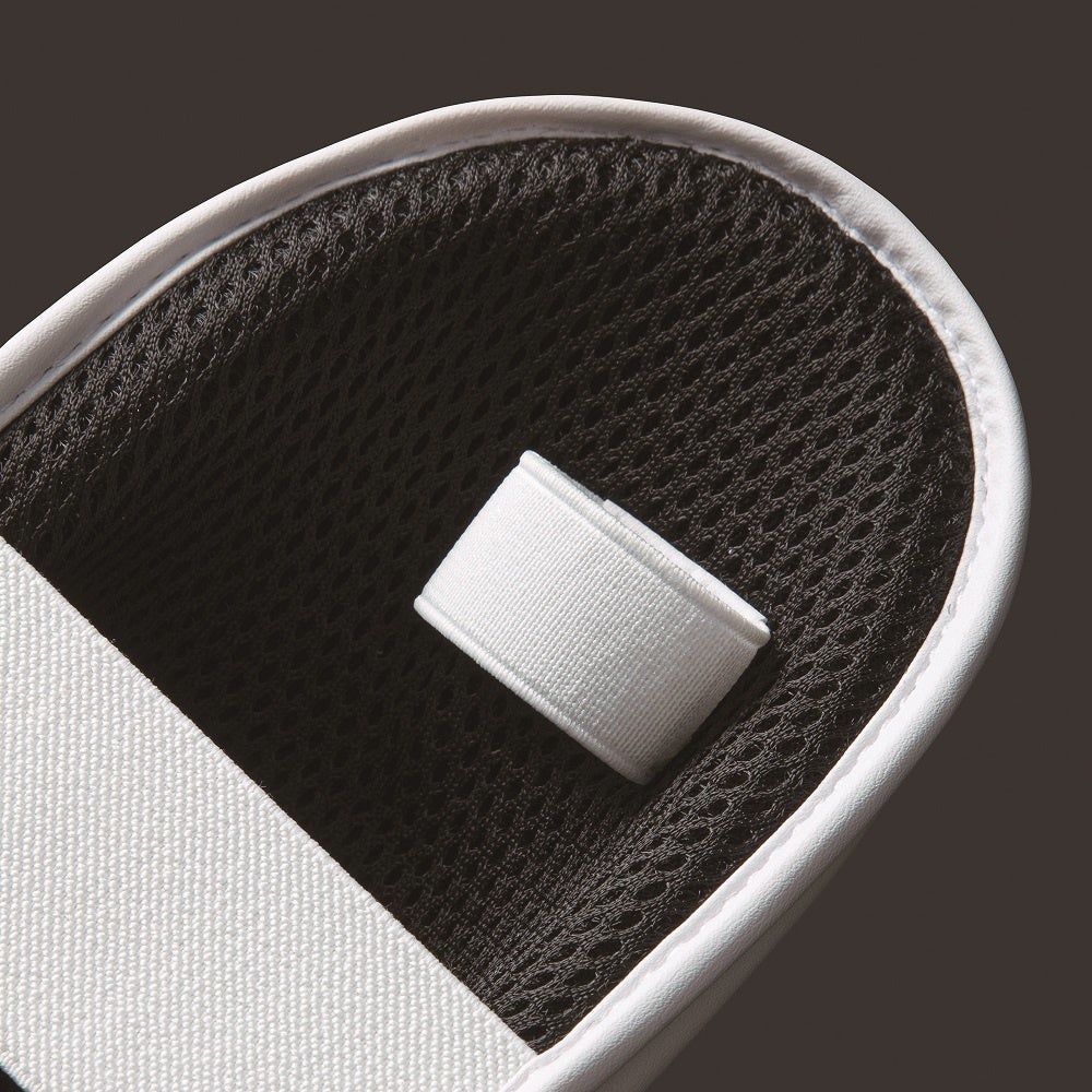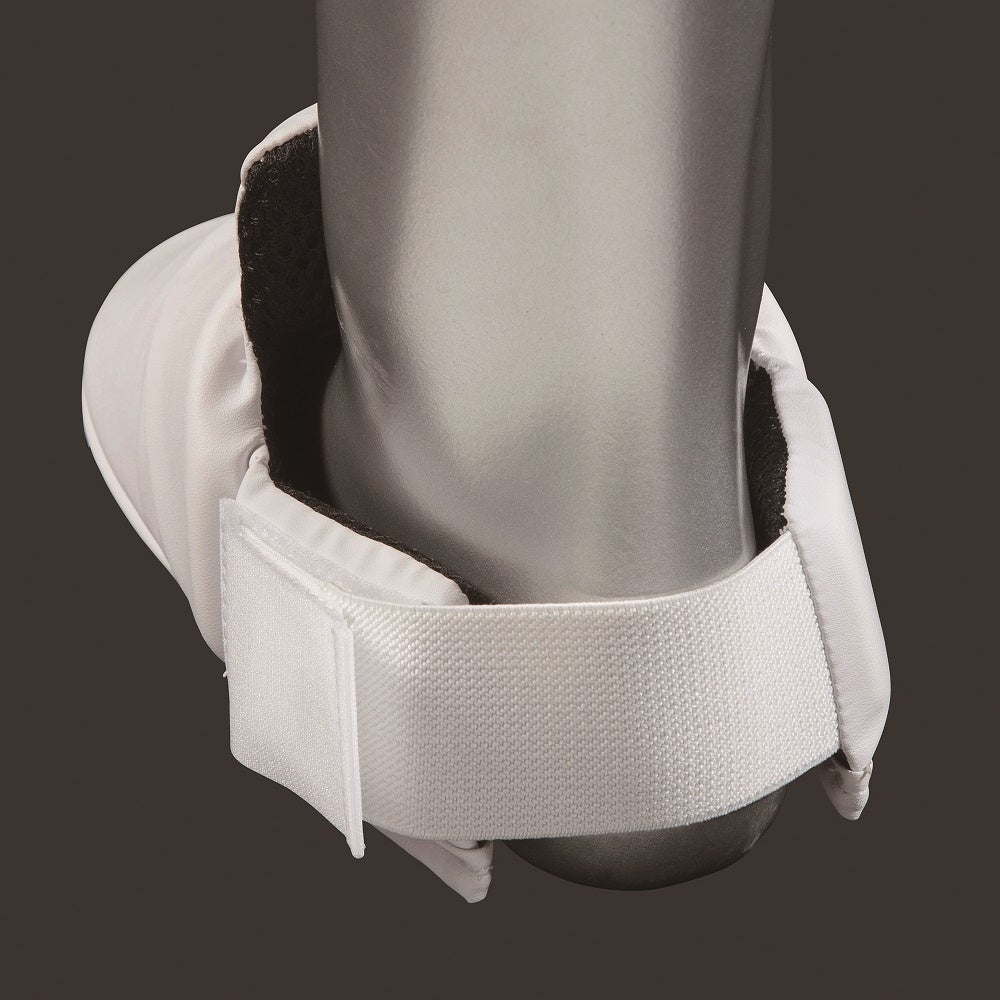 足のつま先部からくるぶし部までガードすることで安全性をサポートし、親指、かかと部にゴムベルトを採用することでホールド性を追求しました。裏地は通気性の高いメッシュ素材を採用し、競技中の快適性をサポートします。また、かかと部のゴムベルトには面ファスナーを使用し、簡単に着脱が可能です。