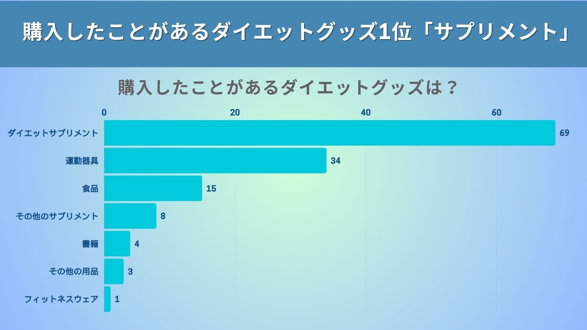 その他のサプリメント(8件)や書籍(4件)は、健康維持やダイエット知識向上を目的に利用されています。フィットネスウェア(1件)やその他の用品(3件)は少ないですが、一部のニーズを反映しています。これらのデータから、手軽で効果的なダイエット方法が求められていることがわかります。