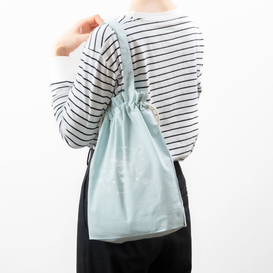 春のお出かけに、ぴったり。春霞のようにやわらかな“ミストブルー”のオリジナル「巾着トート(非売品)」