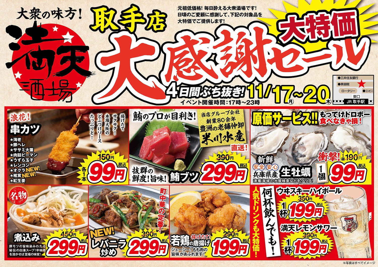 【衝撃の低価格!串カツ、生牡蠣が100円以下】取手の『満天酒場』が11/17(月)から11/20(木)の4日間限定で大感謝セール!