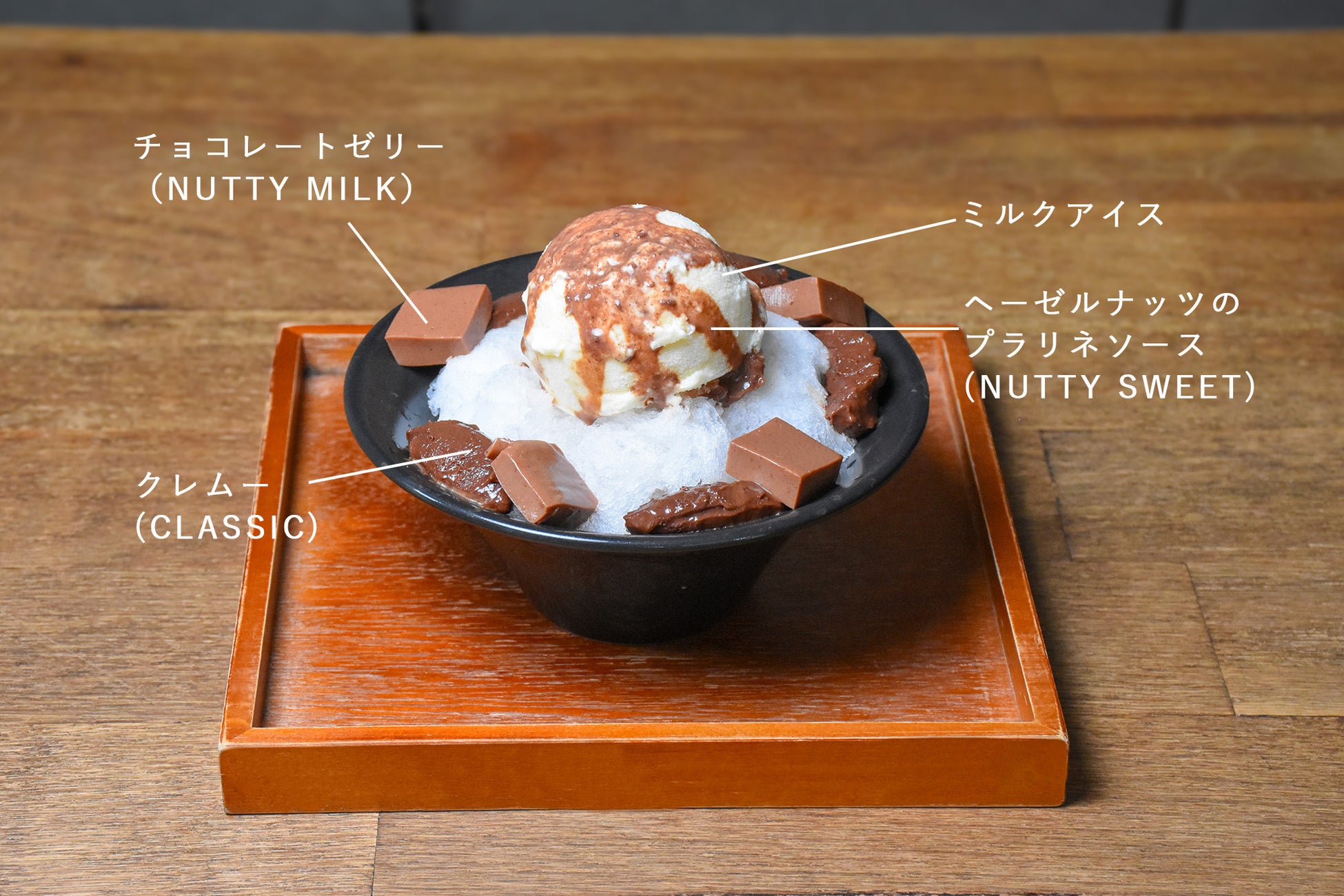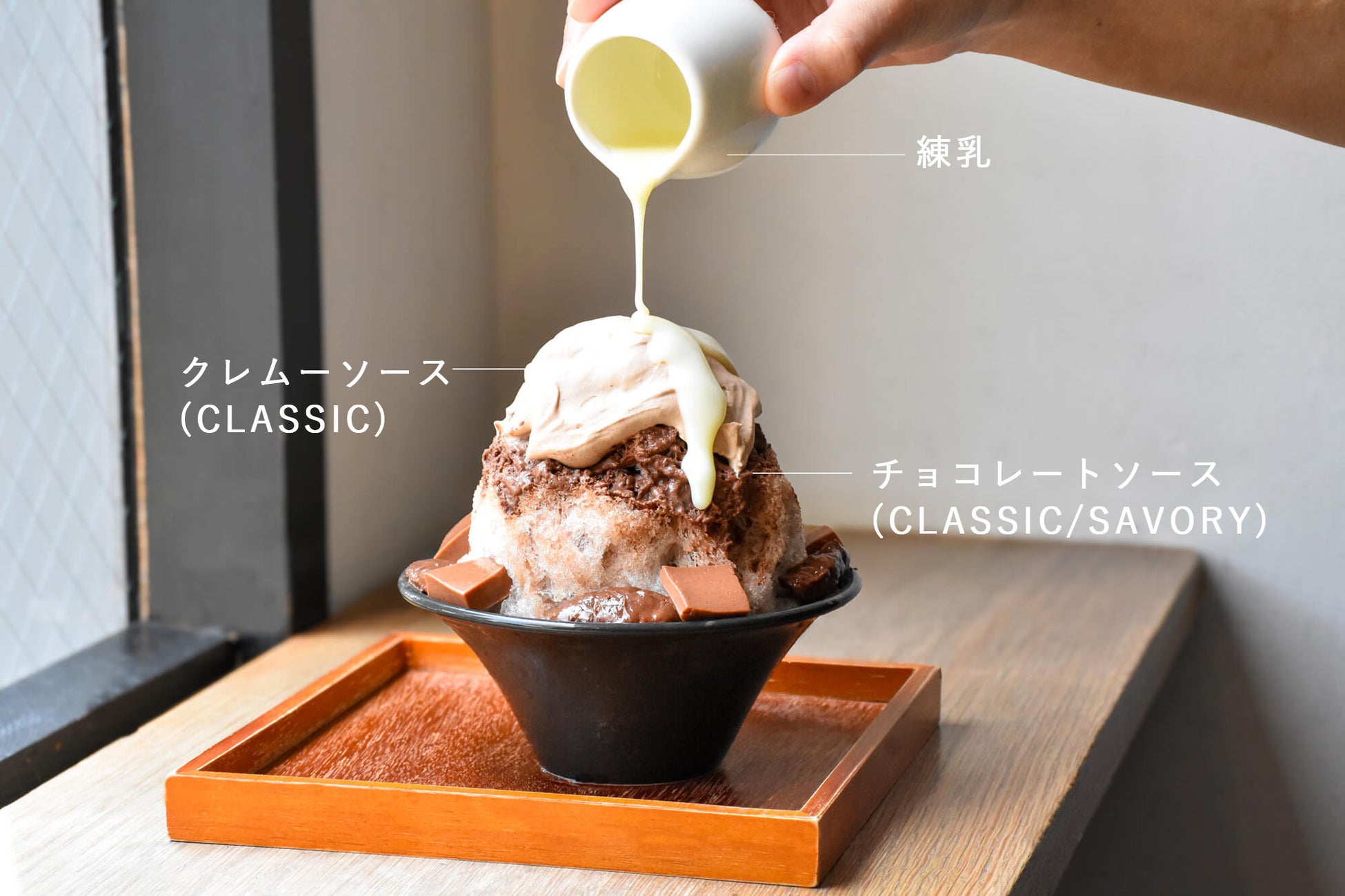 ・チョコレートソース:「CLASSIC」チョコレートと、ハーブやスパイスのようなカカオ由来の奥深い風味をもつ「SAVORY」を用いた、香り・渋味・ビター感が絶妙にバランスするソースです。氷を削る工程の合間ごとに何度も重ねがけしています。重たくなりすぎない後味で、豊かなカカオの風味を感じられます。