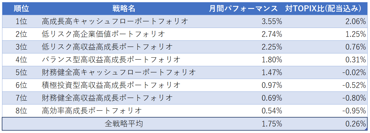 Wealth Wingがご提供する全8戦略の平均運用成績は、月間で+1.75%、対TOPIX比で+0.26%となりました。