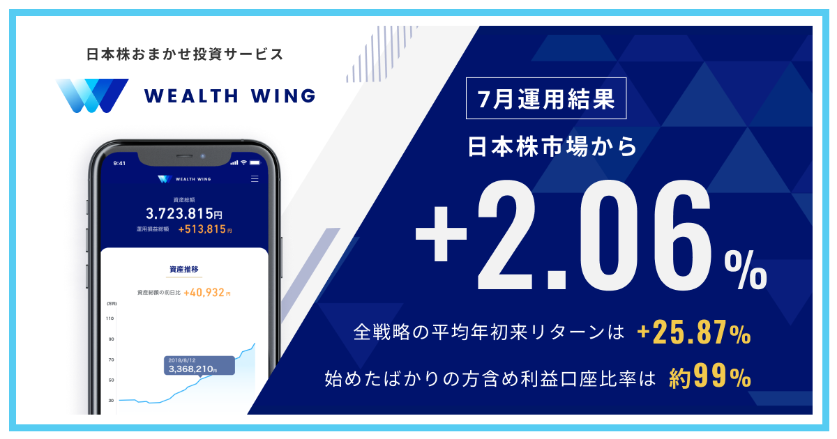 Finatextグループの日本株おまかせ投資サービス『Wealth Wing(ウェルスウイング)』、7月は日本株市場を2.06%上回る運用結果に。