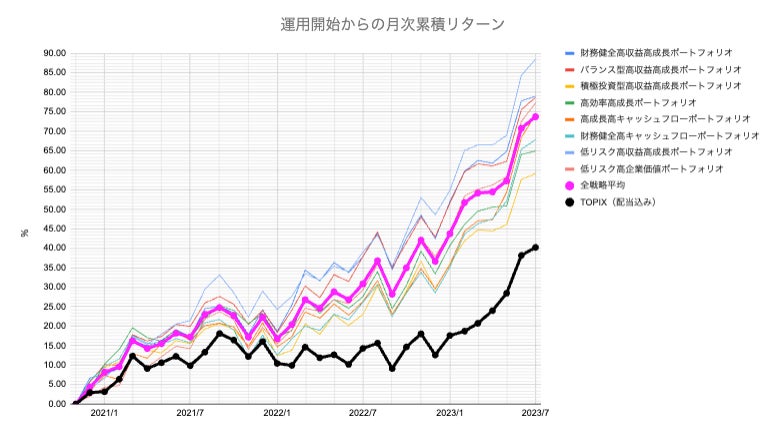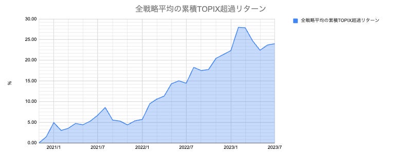 運用開始からの各戦略月次累積リターン、全戦略平均の累積TOPIX超過リターンについては下記グラフをご確認ください。