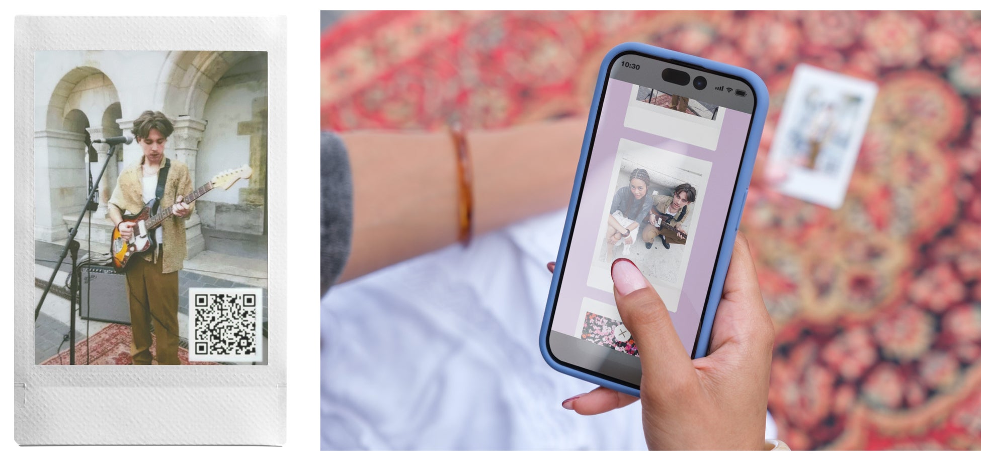 最大10枚の音付き画像から、背景やテーマに合うBGMを付けた最大30秒のスライドショー形式の動画を作成できます。作成した動画はQRコード化し、表紙に選んだ画像と一緒にプリント可能。QRコードはスマホのQRコードリーダーで読み取ることで、動画を再生・ダウンロードできます(※2)。一緒に過ごした思い出をいつでも見返せるチェキプリント™にして渡せば、贈る相手との繋がりが深まります。