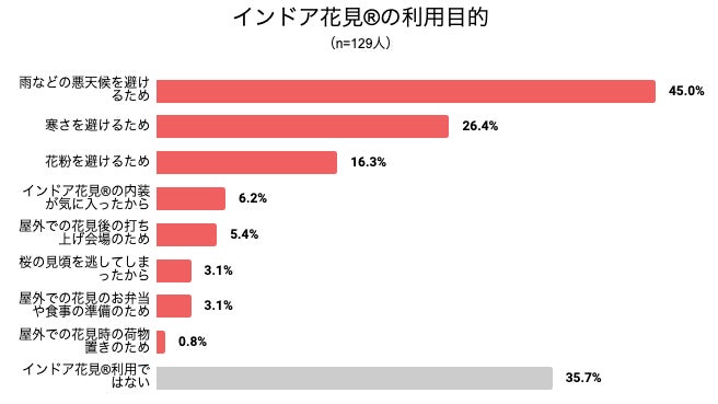 実際にスペースマーケットのインドア花見®︎スペースを利用した人のうち、約45%が「雨などの悪天候を避けるため」と回答。次いで、「寒さを避けるため」が26%、「花粉を避けるため」が16%という結果になりました。