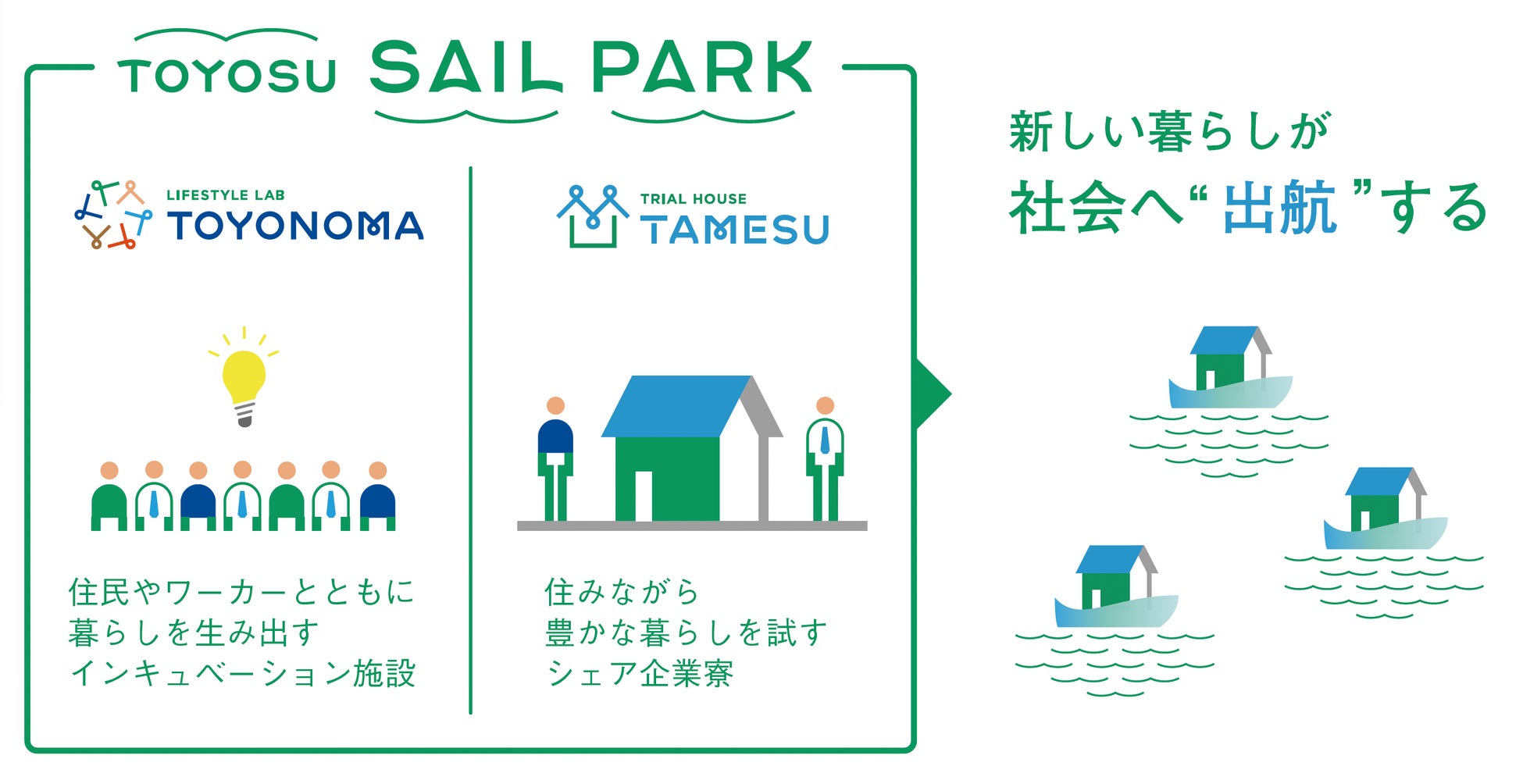職住遊学が交わり育まれる豊洲二・三丁目地区最後の大規模再開発「豊洲セイルパーク」。多様な働き方や人材交流への需要の高まりを背景に、本開発ではインキュベーション施設「LIFESTYLE LAB “TOYONOMA”」(以下、TOYONOMA)、シェア企業寮「TRIAL HOUSE “TAMESU”」(以下、TAMESU)を核とした、働き方・暮らし方を含めた豊かなライフスタイルの創出・発信を進めてまいります。