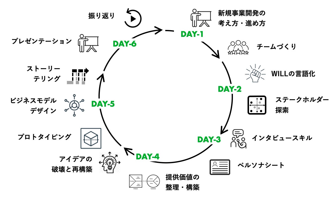 一定新規事業に関する知識を有する人に対して、アイデア創出〜事業計画の策定まで、一通りの事業創出プロセスを実践いただきます。本コースは、3ヶ月ほどの期間で、計6日間の研修を実施します。各回の間で事業検証を進めることにより、事業案を深くブラッシュアップし、高い精度の事業案を創出することができます。