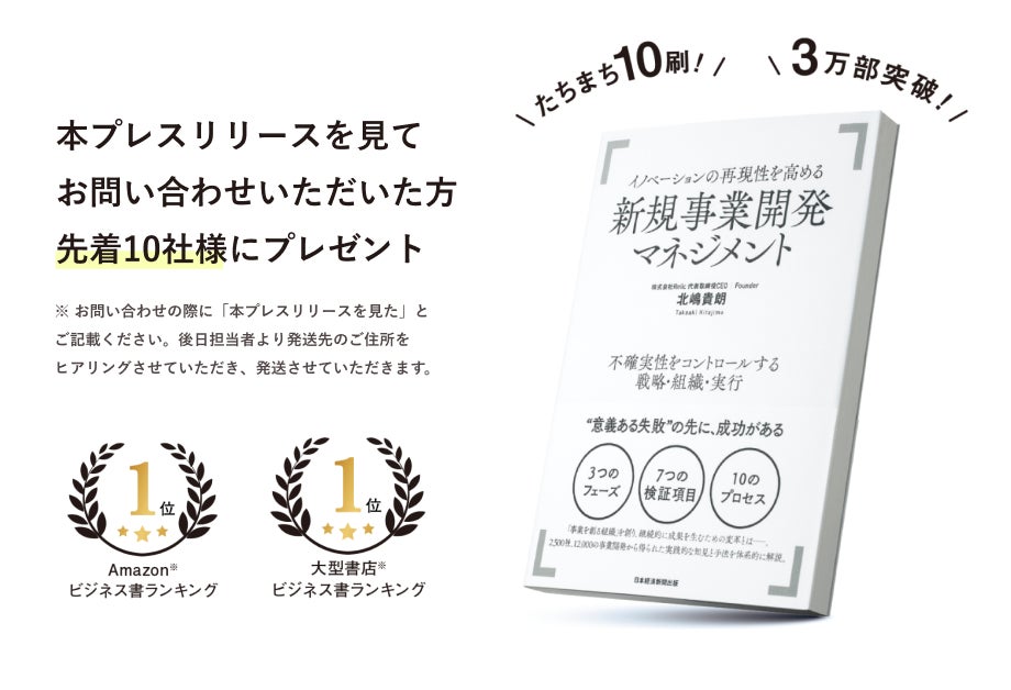 お問い合わせの際に「本プレスリリースを閲覧した」とお伝えいただきましたら、Relic代表取締役CEOの北嶋の著者「イノベーションの再現性を高める 新規事業開発マネジメント ――不確実性をコントロールする戦略・組織・実行」を限定10社様へプレゼントいたします。