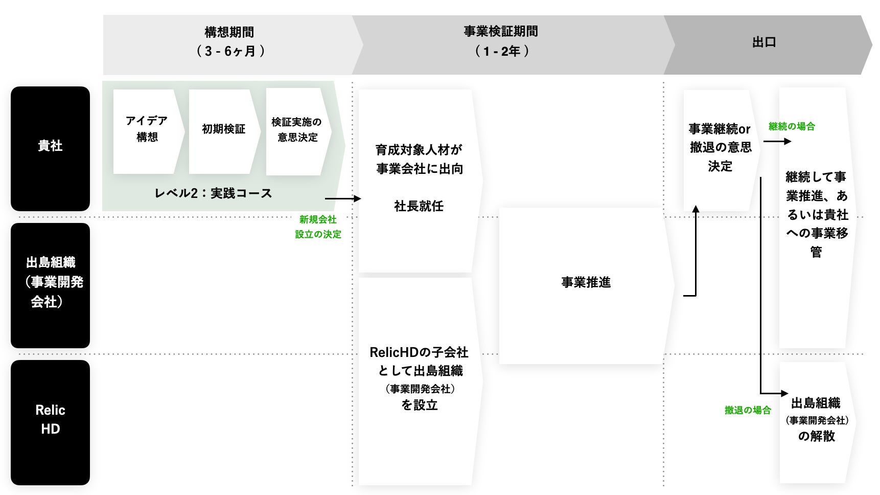 Relicを中核事業会社とする株式会社Relicホールディングスの子会社やクライアント企業とのJVなどの形式で、事業開発を行う会社を設立します。その会社は、企業の出島組織として機能し、経営人材候補の社員が出向し社長として新規事業開発および企業経営を行います。