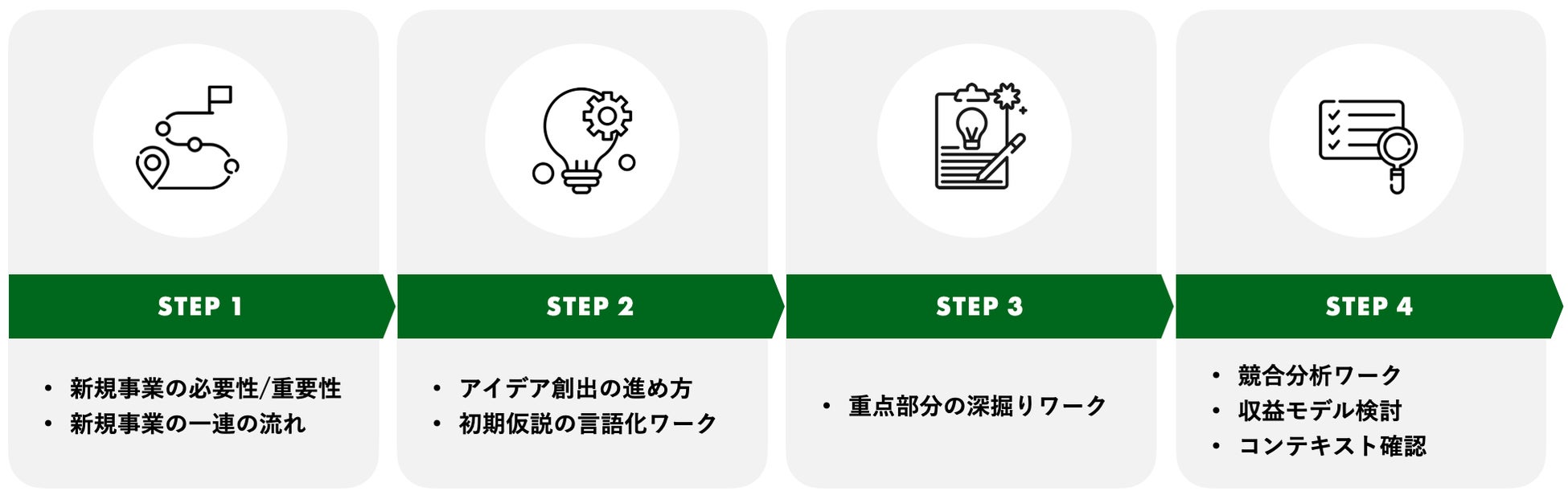 新規事業を初めて推進する方を対象に、必要な基礎知識を身に付けながら、実際に事業アイデアの発想を行っていただきます。参加者は、多面的な視点から事業アイデアを発想し、検証プロセスを学習していただくことで、事業推進に必要となるベースのスキルを習得していただきます。