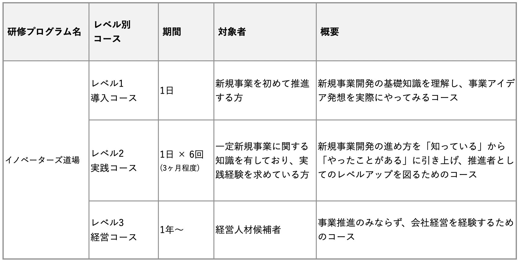 「イノベーターズ道場」では、以下の3つのコースを提供します。