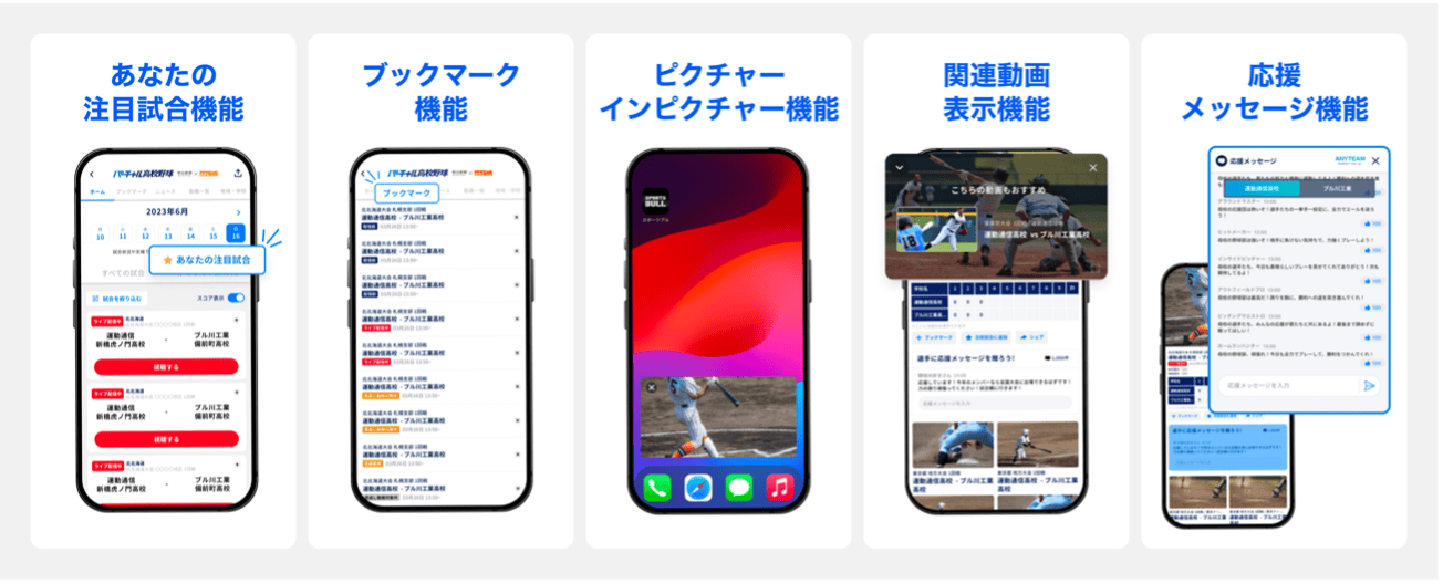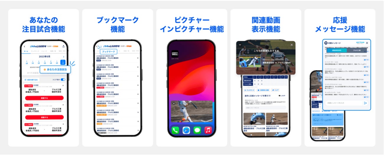 今年も全49地方大会全試合の配信が予定されていることから、多くの試合が同時に配信されていても母校や注目校の試合に迷わず辿り着ける機能や、見逃した試合を後からでも簡単に視聴できる機能など、動画視聴を快適に楽しめるスマホアプリ限定の4つの機能を搭載しました。