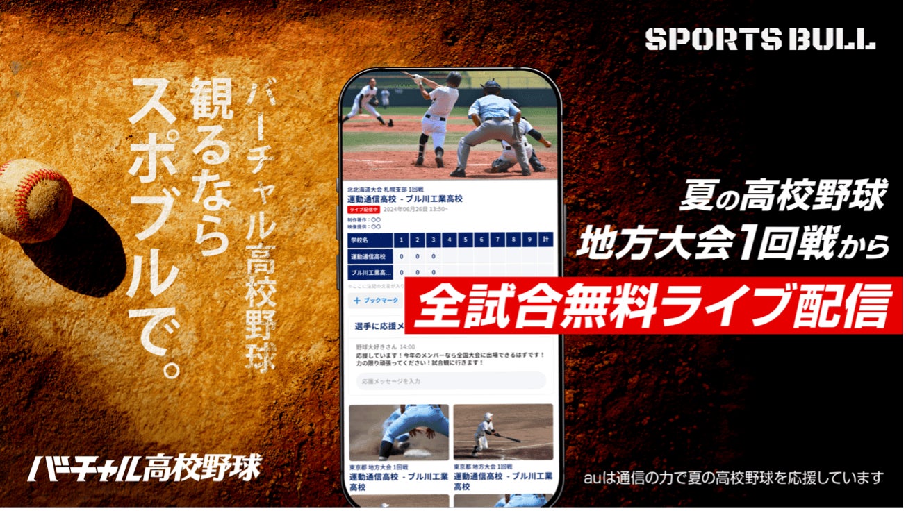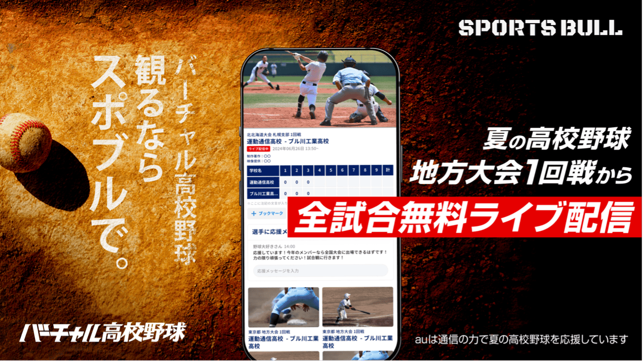 株式会社朝日新聞社(代表取締役社長:中村史郎)と朝日放送テレビ株式会社(代表取締役社長: 今村俊昭)は、KDDI株式会社(代表取締役社長CEO:髙橋誠)の協力のもと、株式会社運動通信社(代表取締役社長:黒飛功二朗)が運営するスポーツメディア「SPORTS BULL(スポーツブル)」内で展開する「バーチャル高校野球」(https://vk.sportsbull.jp/koshien/)にて、第106回全国高校野球選手権大会(主催:朝日新聞社、日本高等学校野球連盟)の無料ライブ配信を実施します。
