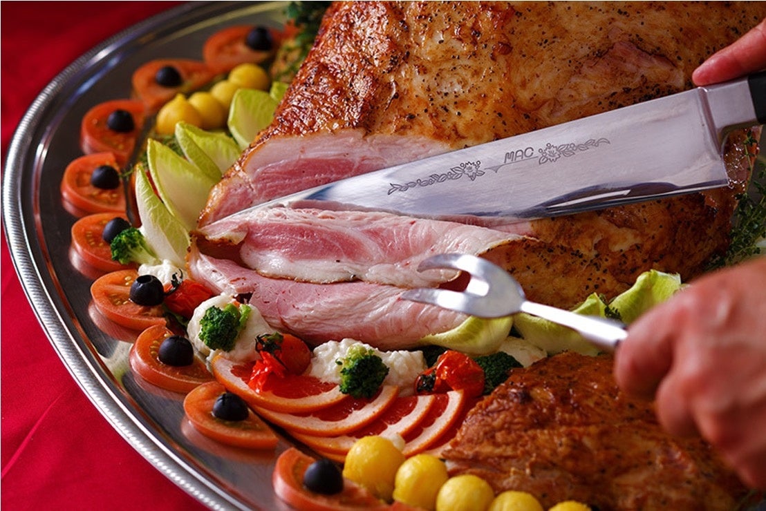 お肉料理には「ローストポーク」をご用意いたしました。低温でゆっくりと火を通したしっとりと柔らかなお肉に、きのこや栗の付け合わせを添えて、ハニーマスタードソースでお楽しみください。