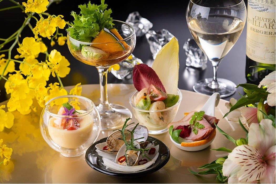 スモークした鴨や、海老風味のフランなど、一口サイズの彩りも鮮やかなアミューズはお食事のスタートに。