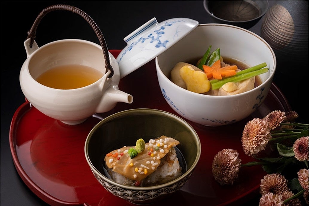 朝食では、「鯛胡麻茶漬け」をお楽しみください。胡麻だれの絡んだ鯛の身をちりめんを混ぜ込んだご飯に乗せて、出汁をたっぷりとかけてお楽しみください。