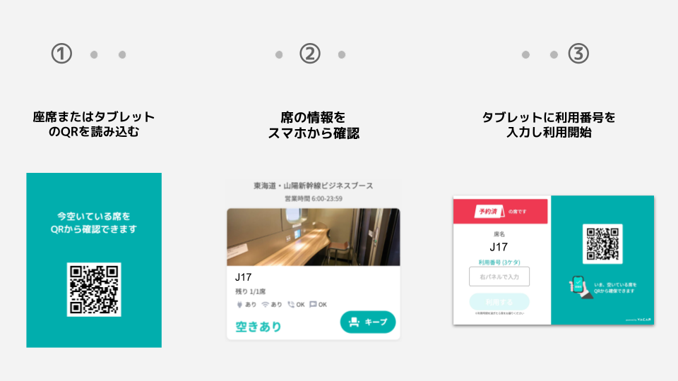 乗車中のお客様はビジネスブースを利用したいタイミングで、新幹線の座席に搭載されているリーフレット、またはビジネスブース内に設置されているタブレットに表示されているQRコード(※2)を読み取るだけで、アプリなどのダウンロード無しに同ブースの予約/利用ができます。