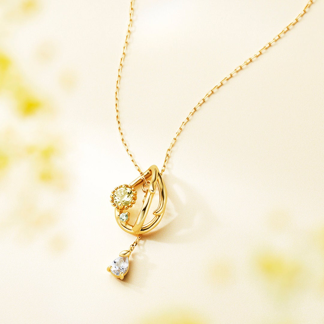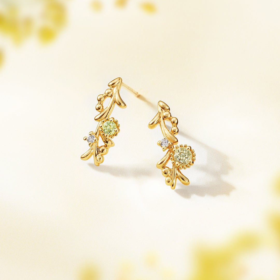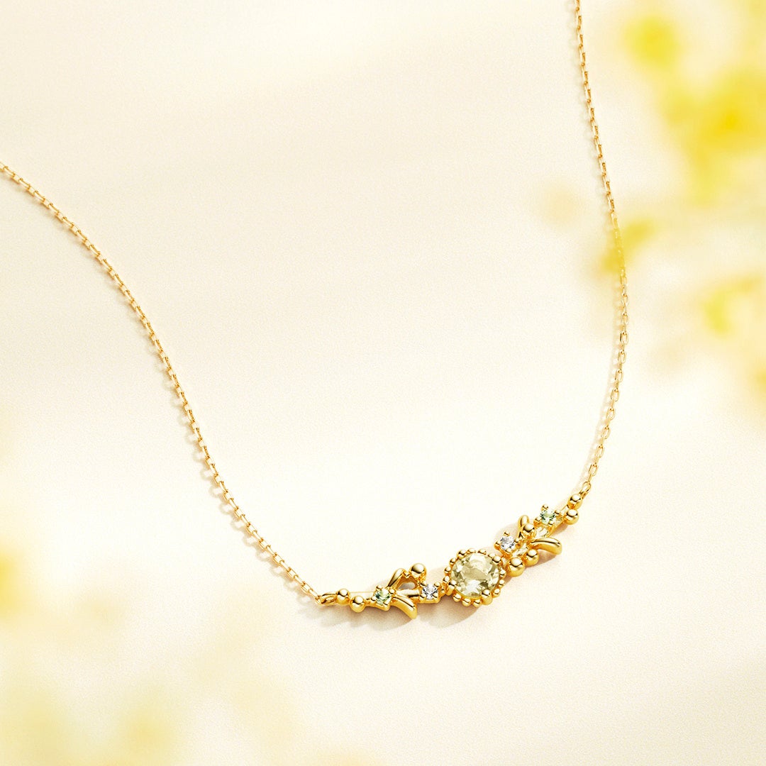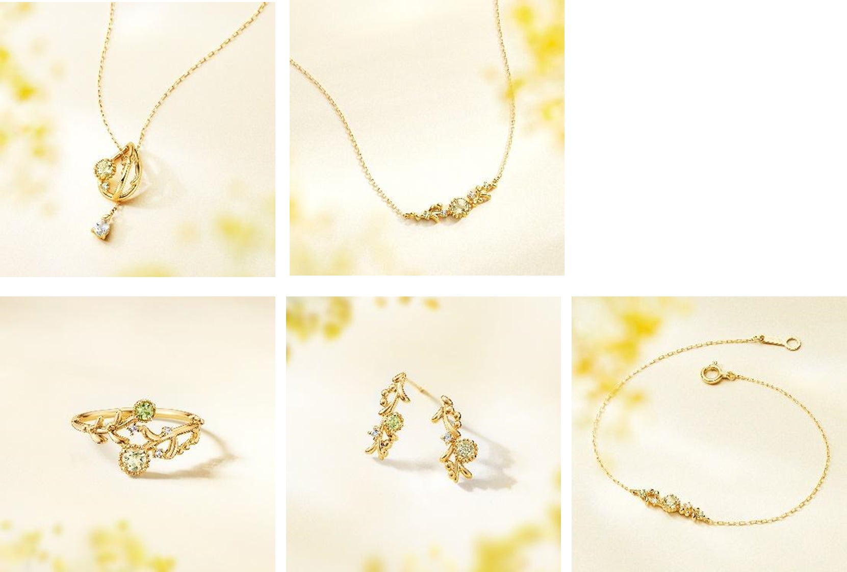 繊細なミモザの花を表現したネックレスは、顔周りの印象を華やげる、かわいらしくも上品なデザインに。ミモザの花をイメージしたレモンクォーツを包み込む地金のラインや、動きに合わせて揺れるチェーンの遊び心が魅力。グリーンカラーのペリドットのアクセントともに、手元に主役級の存在感を添えるリングやブレスレット、耳元をエレガントに彩るピアスもご用意いたしました。