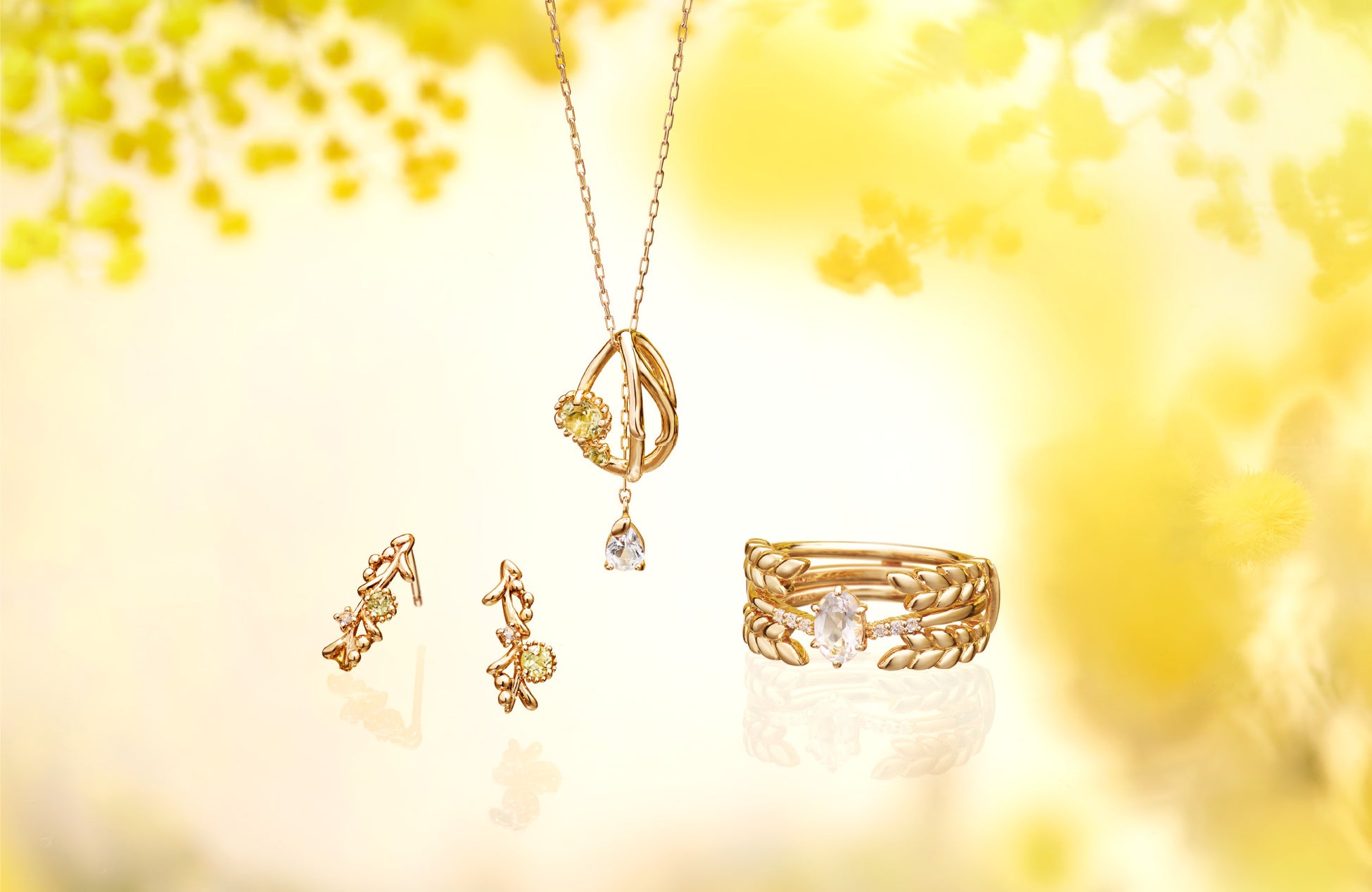 爽やかな風やかすかに香る春の訪れ、舞い踊る花びらに導かれる麗しの花園を思わせる今回のジュエリーたち。新しい季節の始まりに思わず心が踊るきらめく日差しを受けたネックレスやリングが揃います。ミモザのイエローの花々を繊細に表現したイエローゴールドカラーのネックレスや、ライラックの花びらモチーフがひらひらと揺れるピアスとイヤーカフのセットジュエリーなど、身に着けるだけで顔周りが華やぐ特別なアイテムをご用意いたしました。
