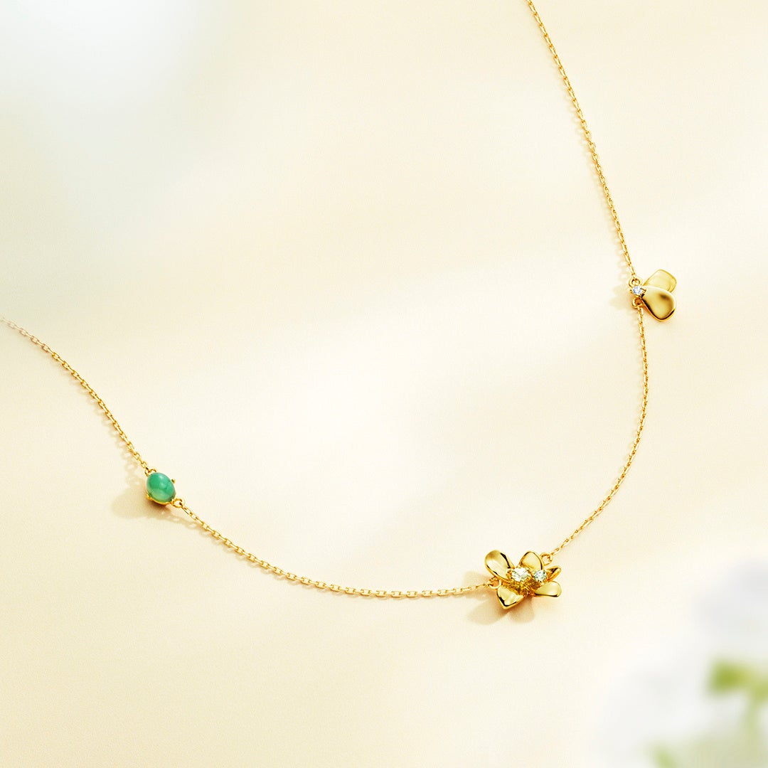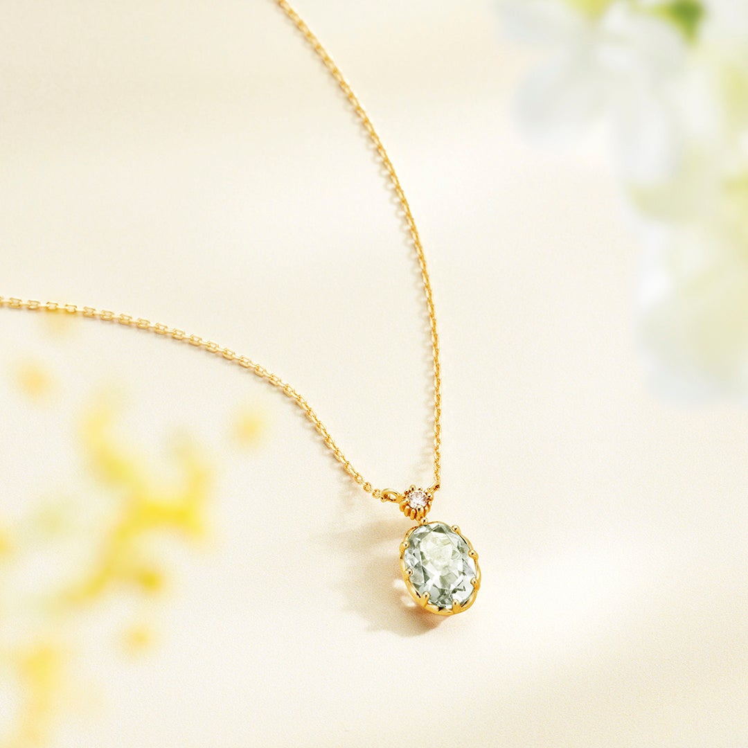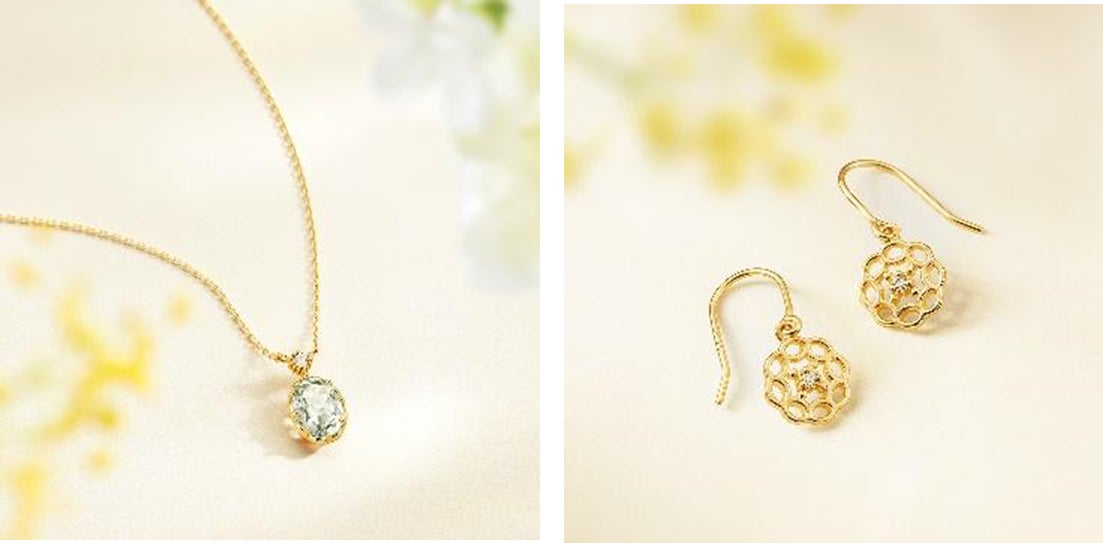 K18イエローゴールドが明るく鮮やかにきらめくシリーズも。大ぶりのグリーンアメシストが輝くネックレスは、葉っぱをイメージした地金のラインがストーンを飾るエレガントなデザインに仕上げました。繊細な葉の模様を表現した地金のデザインが上品に耳元で揺れるピアスも。心地よい爽やかな風が吹く春の季節に、心踊る麗しいジュエリーを身に着けて。